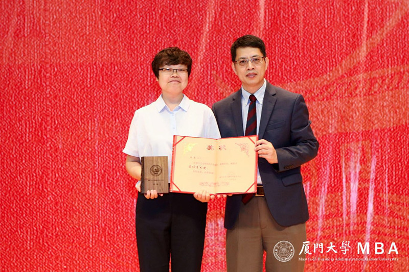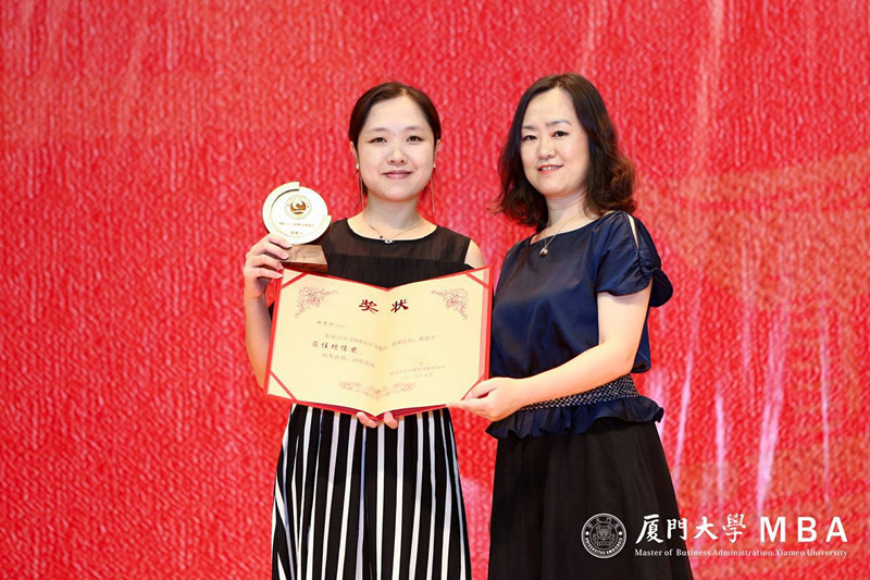 获得2018届“最佳增值奖”的是2015级3班的魏鹭冰同学,入读MBA后,先后在新华都、柒牌、九牧任职,并完成了从财务管控到项目投资管理的转化。凭借其出色的业绩表现,在工作平台和职业发展上实现了较大的跨越。魏鹭冰所在九牧厨卫股份有限公司的财务副总裁杨舒羽女士也特地出席本次毕业典礼并为她颁奖。