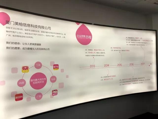 到达企业后,首先我们了解了企业的发展历程。作为一家专注服务女性用户的互联网公司,美柚成立于2013年,至今还不到5年。但公司自成立以来发展十分迅速,2014-2016三年间,接连完成了B、C、D、E四轮融资,其中最近的E轮融资于2016年8月完成,融资金额达到了10亿元。更为难能可贵的是,2016年美柚公司即实现盈利,至2017年,其利润已经超过1亿元。