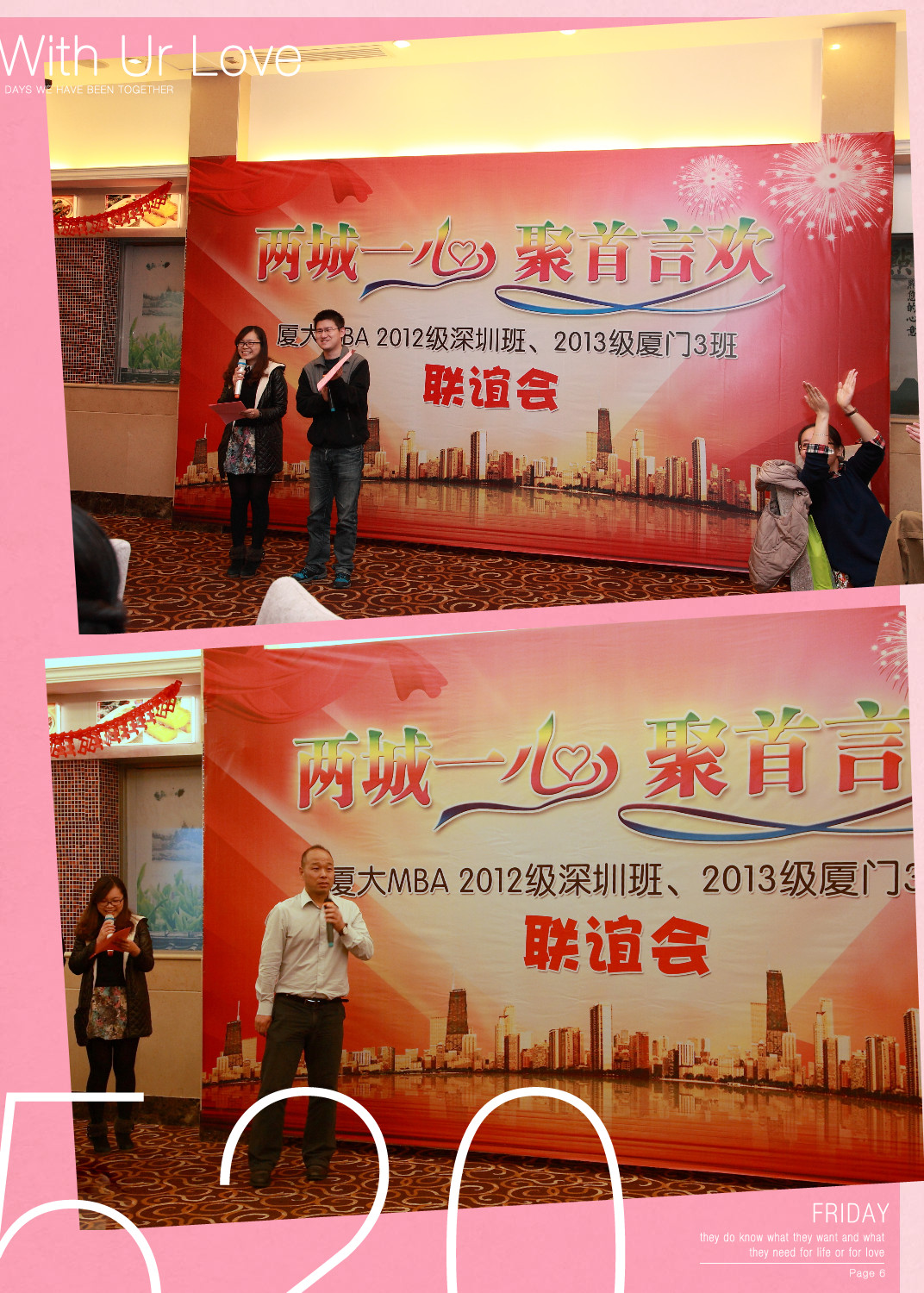 11月30日晚,为欢迎返校学习的MBA2012级深圳班的全体同学,厦门大学管理学院MBA中心特意为他们安排了一场以“两城一心,聚首言欢”为主题的联谊晚会,2013级厦门3班的同学们代表厦门地区全体同学,向远道而来的深圳班同学送上了最真诚的欢迎和祝福。管理学院傅小凡教授、周欣副教授、MBA中心吴翀副主任,陈华老师在百忙之中莅临出席,与两班的同学们共度美好的一夜。