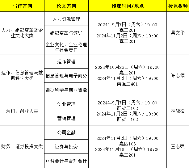 2.两次课程授课内容不同,同学需完整学习此次专业方向论文辅导的两次课程,此次为现场授课,不开设线上课程,无法参加现场授课的同学,需提前向中心请假(发送邮件至mba7@xmu.edu.cn,邮件中写明学号、所属班级、姓名、申请事由,若为出差,请附上出差相关证明)。